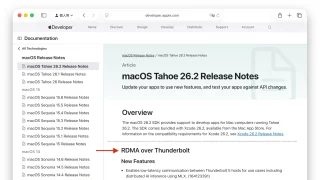 macOS 26 Tahoe macOS 26.2 Tahoeでは、Thunderbolt 5搭載のApple Silicon Mac間でDirect Memory Accessを可能にする「RDMA over Thunderbolt」がサポートされ、MLXを利用した分散推論などに利用可能に。