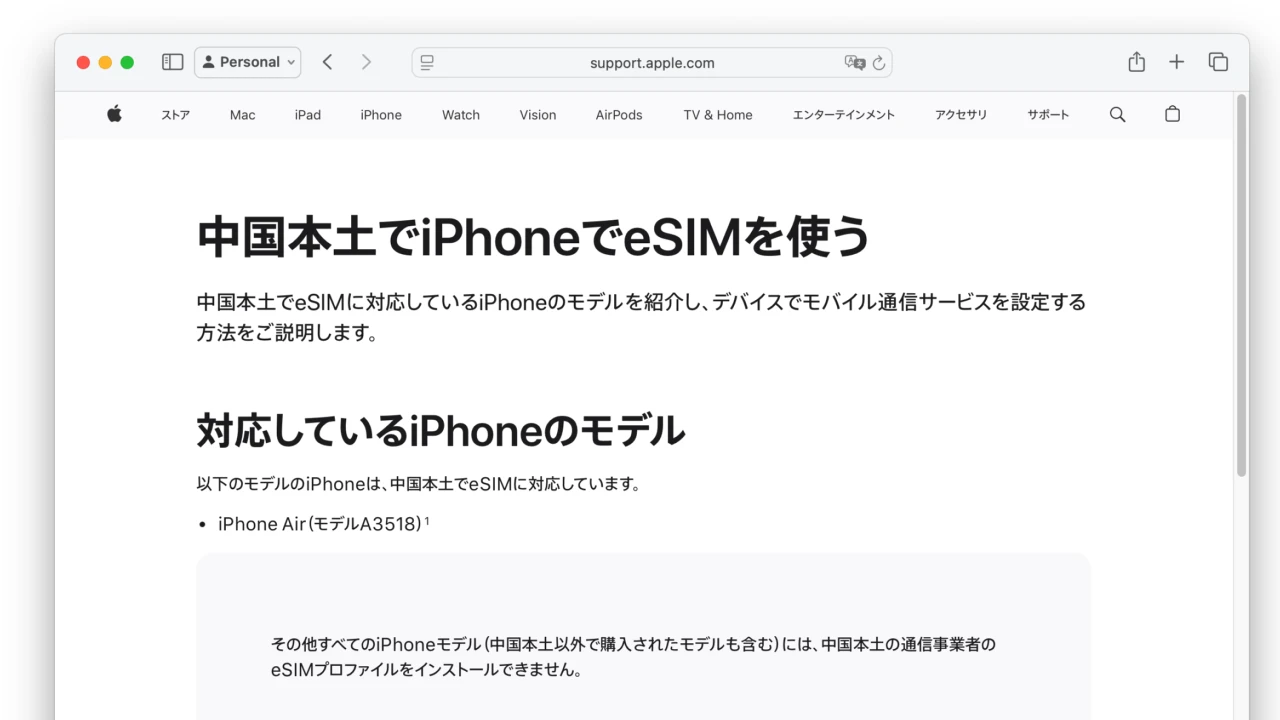 - 中国本土でiPhone AirのeSIMをアクティベートするには、中国本土でeSIMに対応しているiPhoneモデルを入手し、ご契約先の通信事業者の店舗にご来店ください。