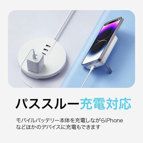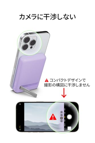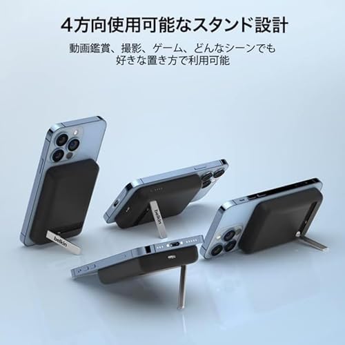 MagSafe対応のiPhoneにマグネット接続し、パススルー充電やスタンド機能を備え、iPhoneを最大7.5Wでワイヤレス充電可能なモバイルバッテリー。