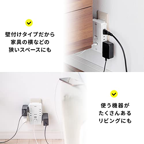 差込口を90°回転することができるコンセント直付けの6個口タップ。最大3.4A出力のUSB-A x2ポート付でケーブルモデルもセール中。