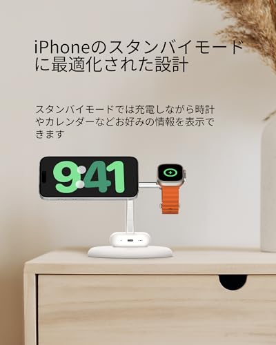 Qi2対応のワイヤレス充電スタンドとApple Watch充電スタンド、AirPods充電器を備えたワイヤレス充電スタンド。