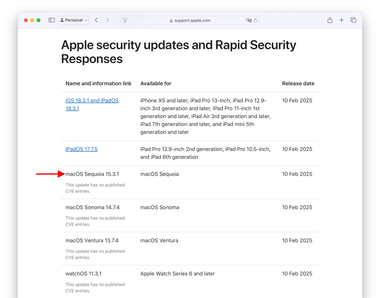 Appleが公開したリリースノートは、macOS 15.3と変わらず「このアップデートには重要なセキュリティ修正が含まれ、すべてのユーザに推奨されます。」と記載されていますが、Appleが別途公開したセキュリティコンテンツによると、今回のアップデートには脆弱性の修正(CVE)が含まれていないそうなので、何かしらの不具合(または、まだ詳細が公開できない脆弱性)が修正されたようです。