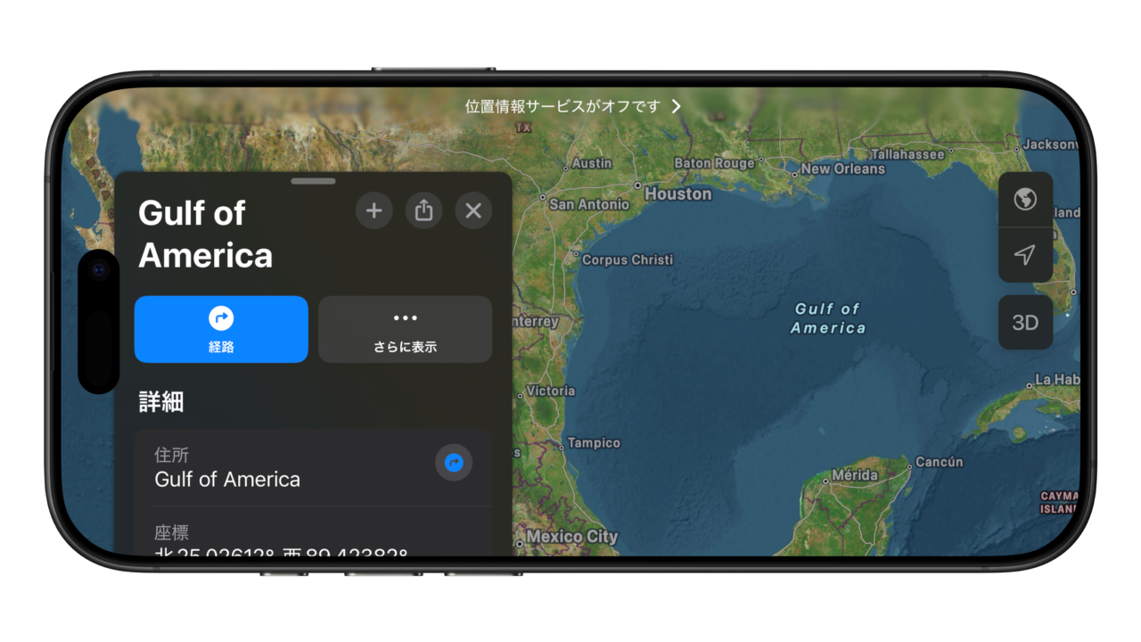 現在のところAppleもGoogleともに、アメリカ地域でのみ「アメリカ湾 (Gulf of America)」表記を採用しており、日本語表記では引き続き「メキシコ湾*」で表示されますが、