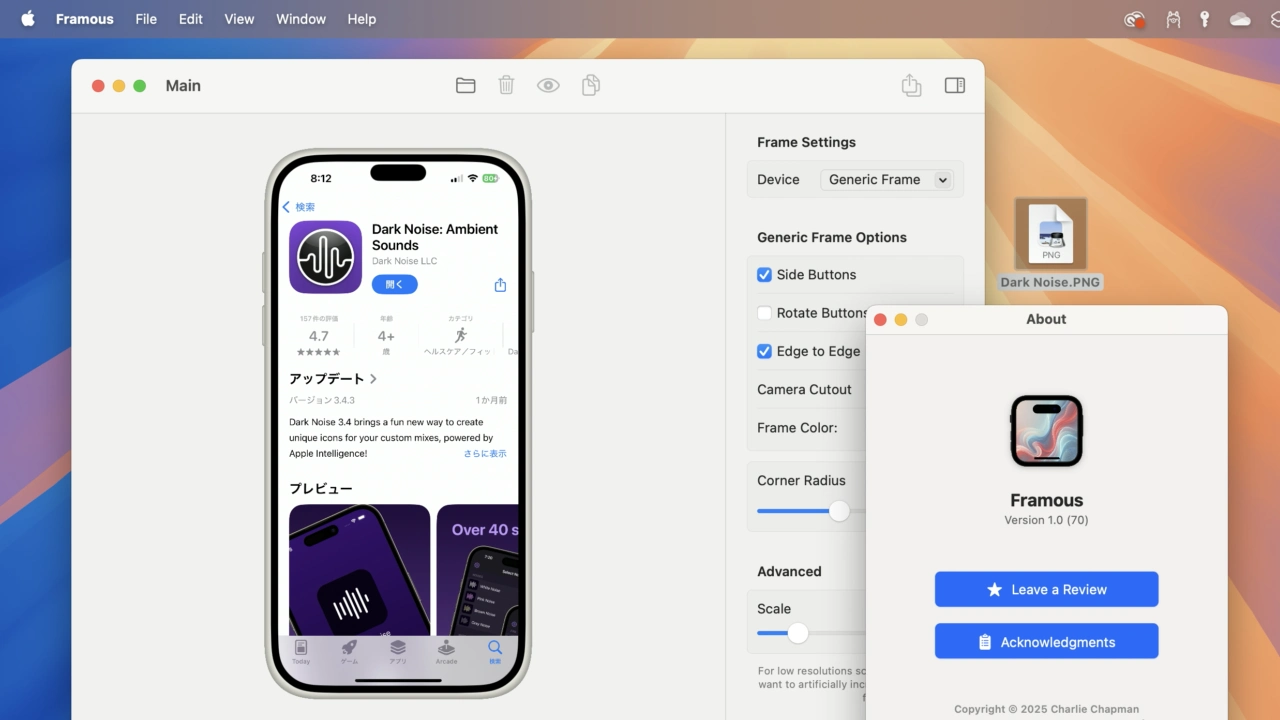MacやiPhone、iPad、Vision Pro上で雨の音や川のせせらぎ、暖炉で木が燃える音など環境音やノイズを再生し、ユーザーをリラックス&集中力を向上させるアプリ「Dark Noise」シリーズを開発するDark Noise LLCのCharlie Chapmanさんは現地時間2025年02月25日より、Appleデバイスなどのスクリーンショットをドラッグ&ドロップするだけで、デバイスフレームを付けてくれるMacアプリ「Framous」をリリースしたと発表しています。