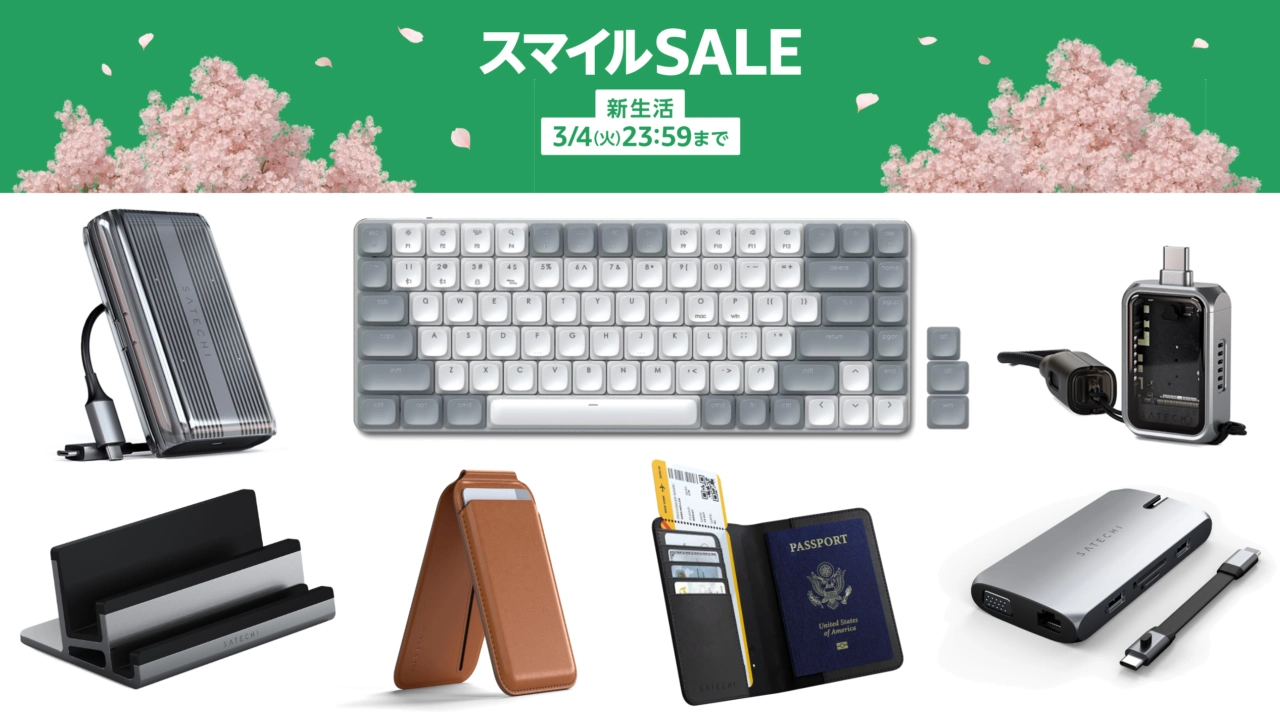 Amazon Japanは日本時間2025年02月28日から03月04日まで、新生活に必要な日用品や家電、ファッションなどを特別価格で提供するスマイルSALE新生活を開催していますが、このセールに合わせて、SatechiのSM1メカニカルキーボードやUSB-Cハブ、NVMe SSDエンクロージャー、アルミニウムスタンドなどが特選タイムセールとなっています。