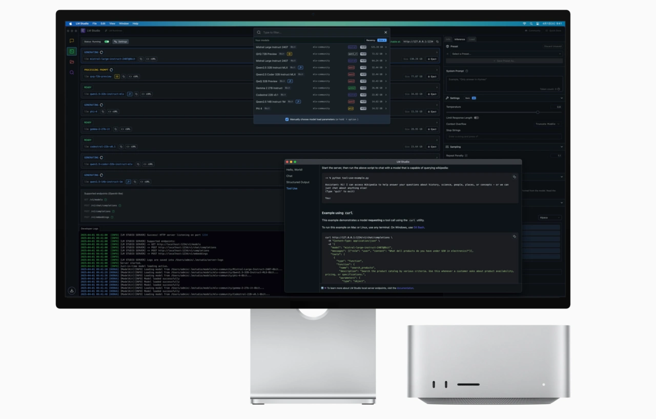 Mac StudioはAIのためのパワーを備え、先進的なGPUと、M3 Ultraではパーソナルコンピュータ史上最も大容量となる最大512GBのユニファイドメモリにより、6,000億以上のパラメータを持つ大規模言語モデル(LLM)を完全にインメモリで実行できます。