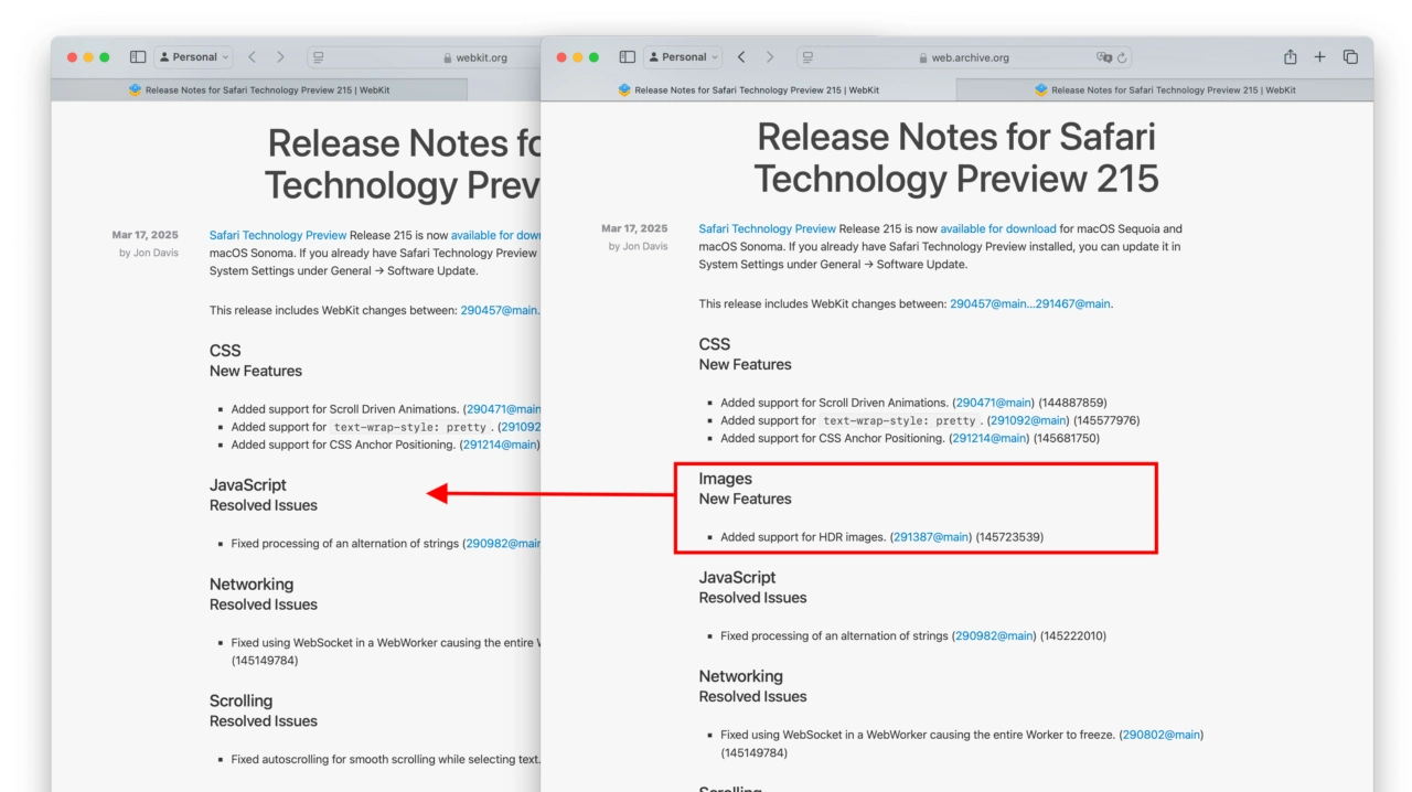 ただし、AppleはAppleはmacOS 15.4 SequoiaとiOS 18.4に同梱している「Safari 18.4」のリリースノートにHDRイメージのサポートを明記しておらず、Safari v18.4のリリースと同時に、03月17日に公開したSafari Technology Preview 215のリリースノートから「Added support for HDR images」の一文を削除しているので、何らかの事情によりフルサポートは見送られたようで、