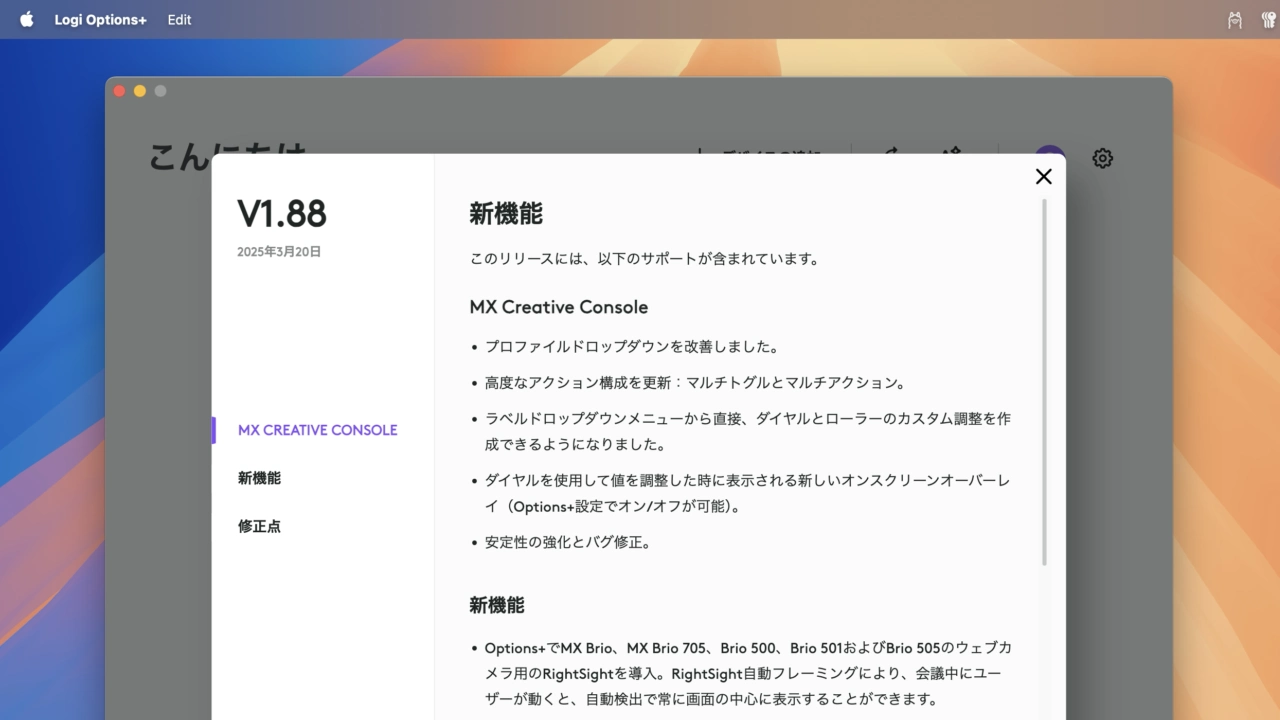 LogitechがMX Creative ConsoleやMX Brio 705、50x用の新機能を追加した「Logi Options+ v1.88」をリリースしています。詳細は以下から。