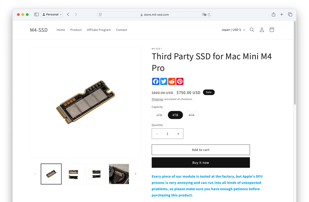 Technojoyのサードパーティ製SSD for Mac mini M4 Proの価格は1年間の保証付きで2TBモデルが300ドル(約4万4千円)、4TBモデルが750ドル(約11万円)でApple StoreでのCTO価格の半額程度になっていますが、初回販売数は50台と少ないそうなので、AliExpressなどで一般に購入できるようになるまでにはもう少し時間がかかりそうです。