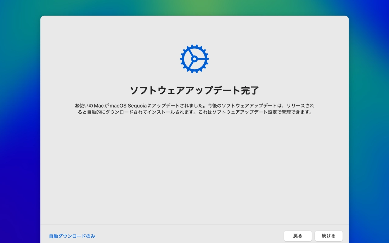 お使いのMacがmacos Sequoiaにアップデートされました。今後のソフトウェアアップデートは、リリースされると自動的にダウンロードされてインストールされます。これはソフトウェアアップデート設定で管理できます。