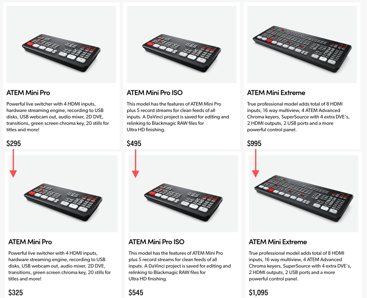 Blackmagic Designによると、DaVinci ResolveとBlackmagic Cloudに関しては元の価格を維持しているものの、Pocket Cinema Cameraシリーズや映像スイッチャーATEM Miniシリーズなどは既に値上げされており、ATEM Mini Proは295ドルから325ドルへと約10%ほど値上げされています。