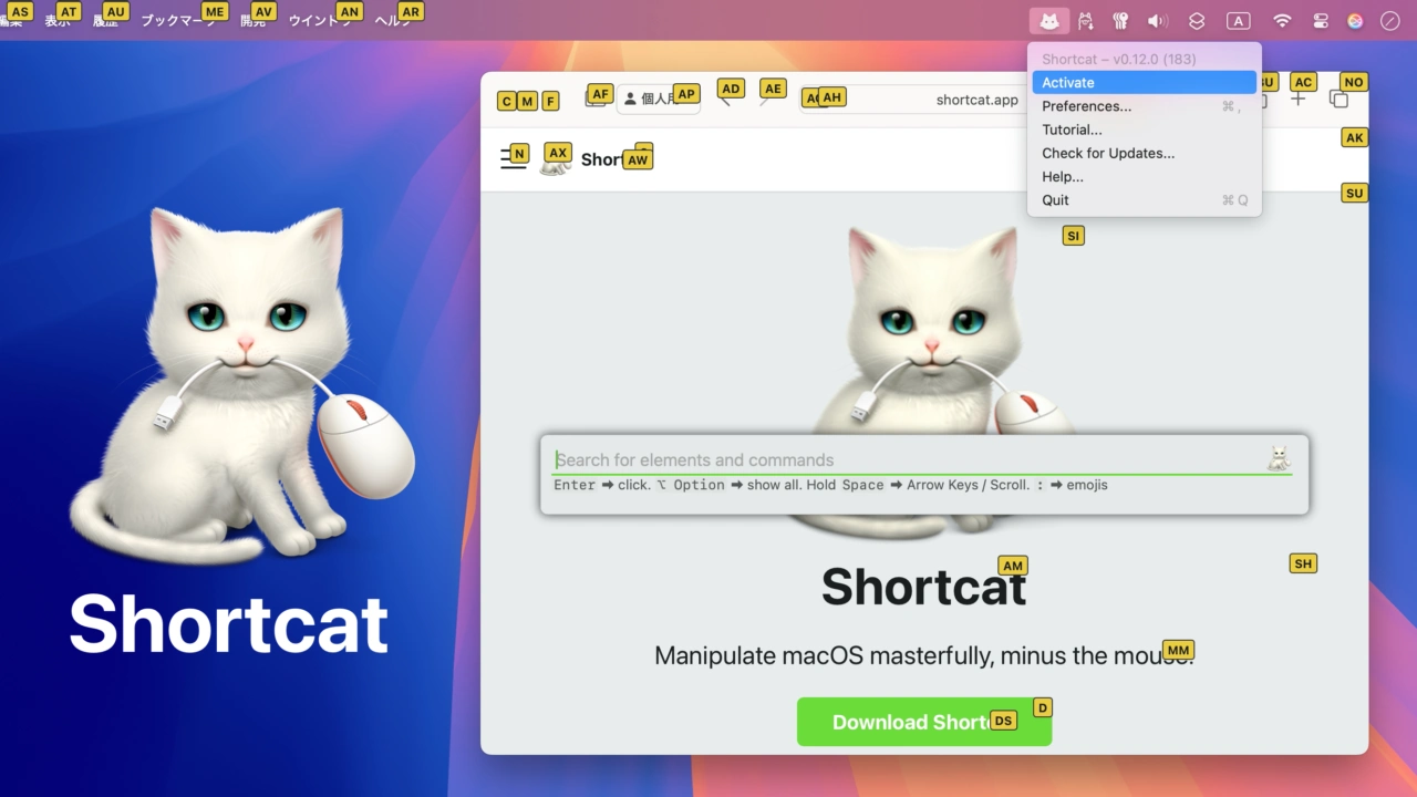 ShortcatはオーストラリアのJack Chenさんが開発しているMac用ユーティリティで、Vim MotionやVimacのようにmacOSのアクセシビリティ機能を利用し、キーボードのみでUIを操作できるようにしてくれますが、このShortcatが約2年ぶりにアップデートされ最新のmacOSに対応しています。