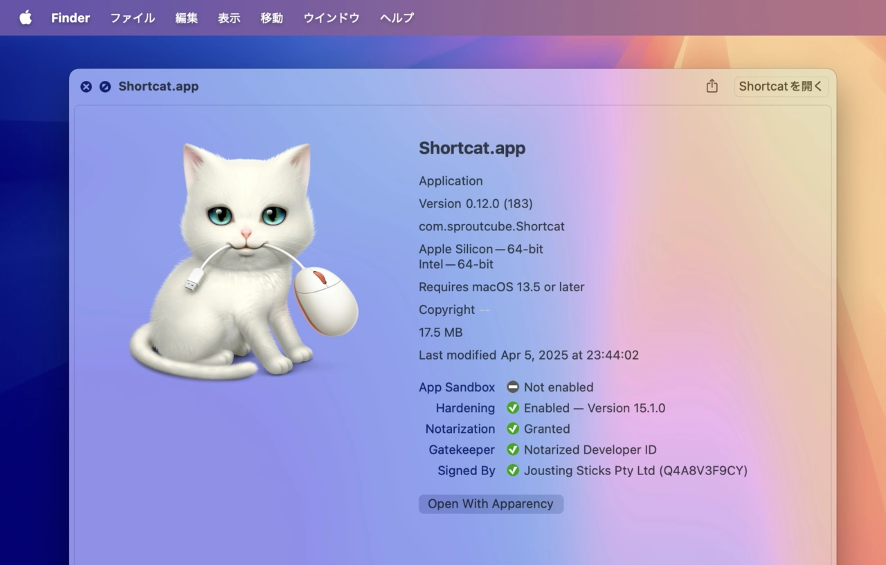 Shortcat v0.12.0は新たにJackさんが設立した会社Jousting Sticks Pty LtdのApple Developerアカウントで署名されているため、再度アクセシビリティ許可が必要になっており、さらに最小システム要件がmacOS 13 Ventura以上のIntel/Apple Silicon Macとなっているので、アップデートされる方は注意してください。