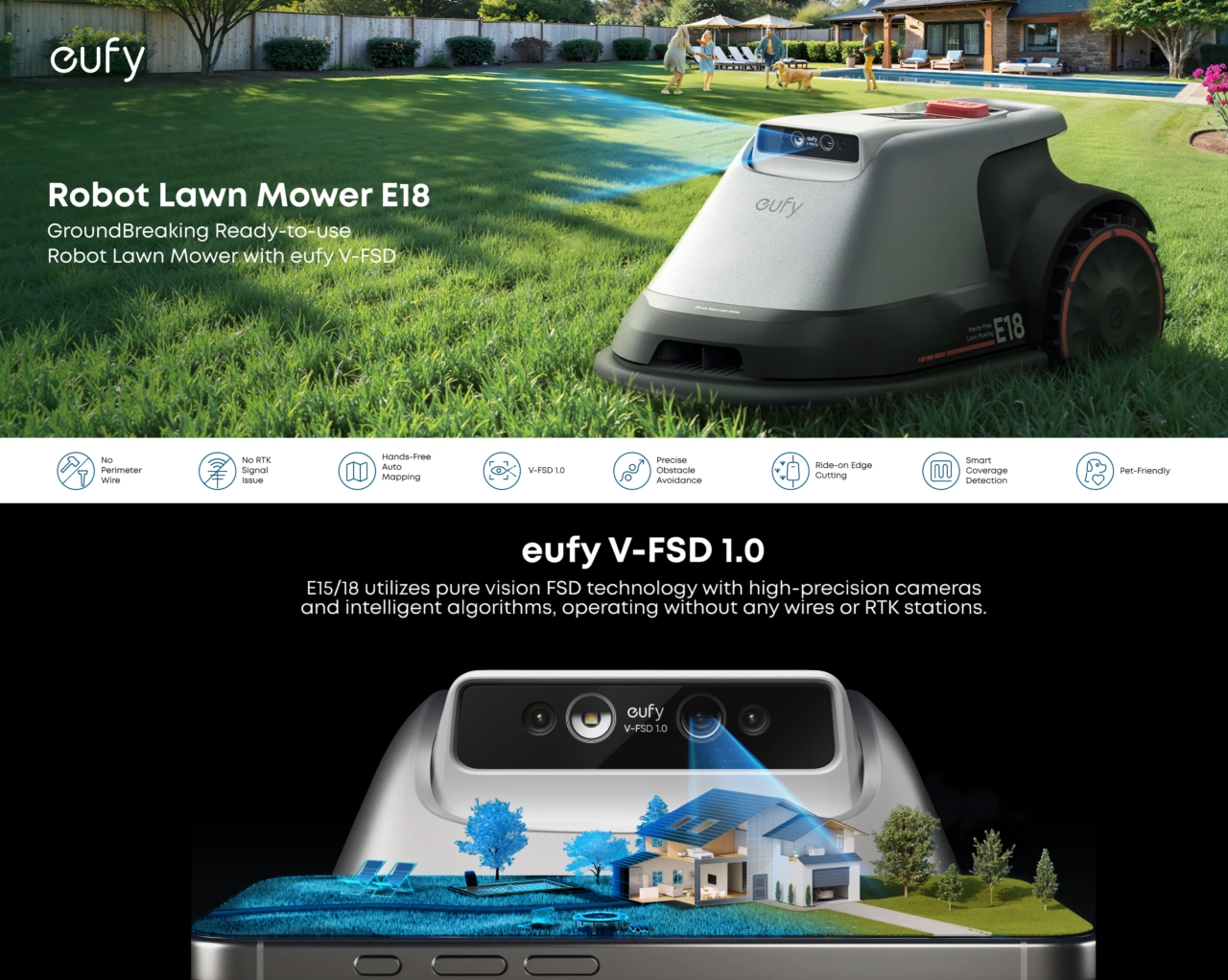 庭を移動しながら自動的にスキャンとマッピングを行う独自のeufy V-FSD 1.0技術(Vision Full-Self Driving)により、完全ハンズフリーで開封後5分で使い始めることができるとされており、スマートフォンアプリによるエリア指定にも対応。