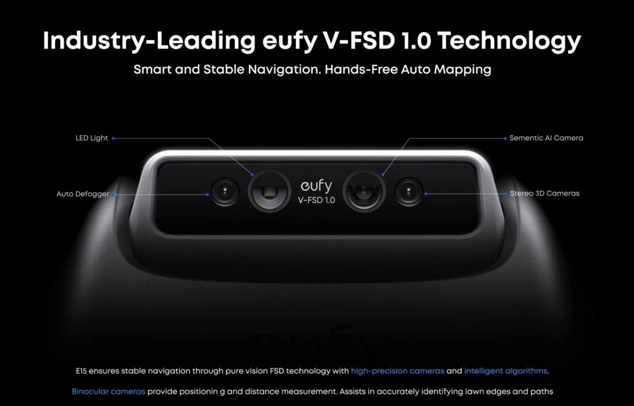 Ankerによると、eufy Robot Lawn Mowerシリーズはアメリカのロボット芝刈機メーカーTerraMowと共同開発されたロボット芝刈機で、一般的なロボット芝刈機は、庭に境界を示すワイヤーやアンテナを設置する必要がありましたが、eufy Robot Lawn Mowerは上部に取り付けられたLEDライトとAIカメラ、曇り止め防止機構を搭載した2つの3Dカメラを利用し、