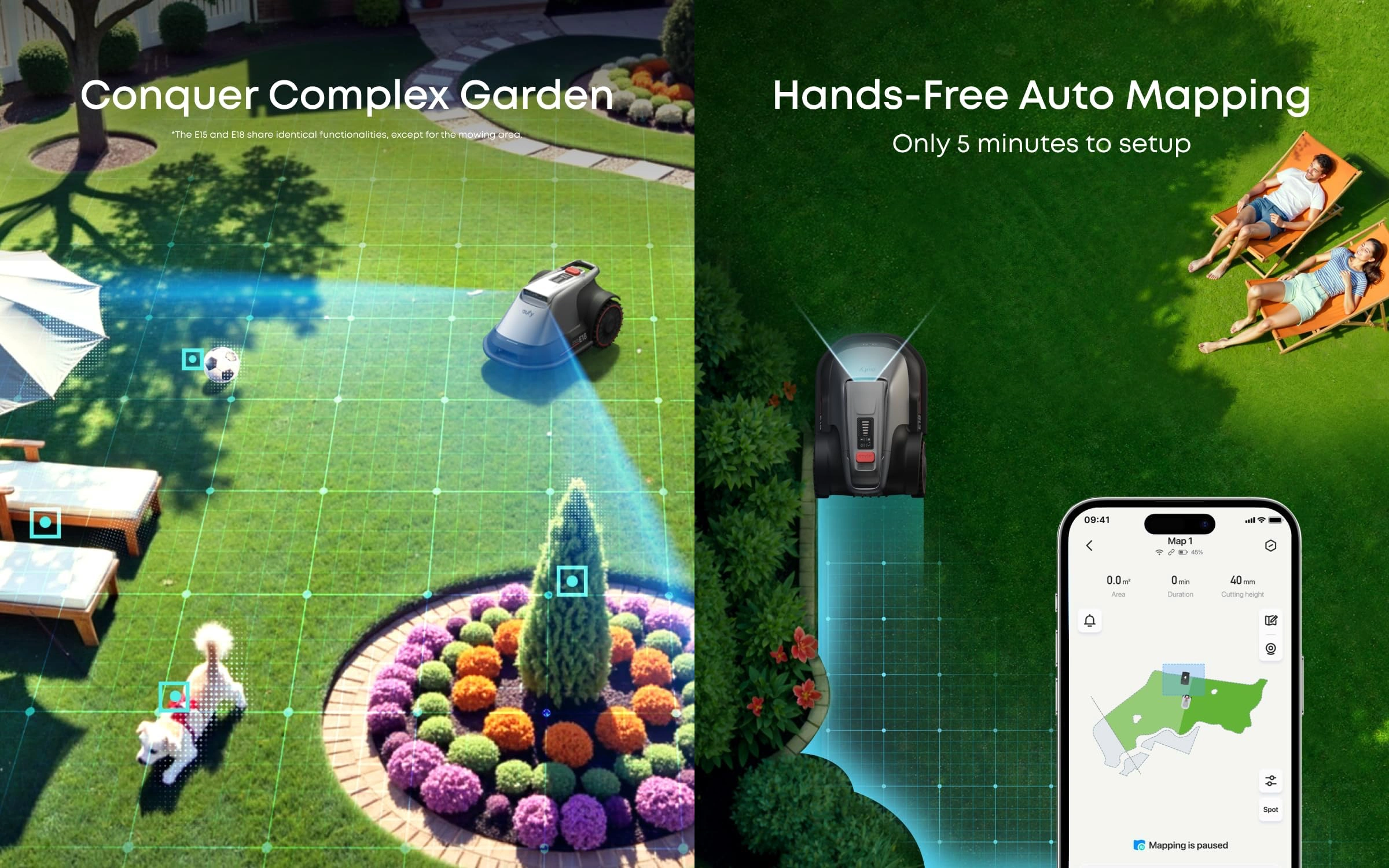 No Wires, No RTK, No Signal Issues: automatic robot lawn mower E18 utilizes pure vision FSD technology with high-precision cameras and intelligent algorithms, eliminating the need for wires or an RTK station.