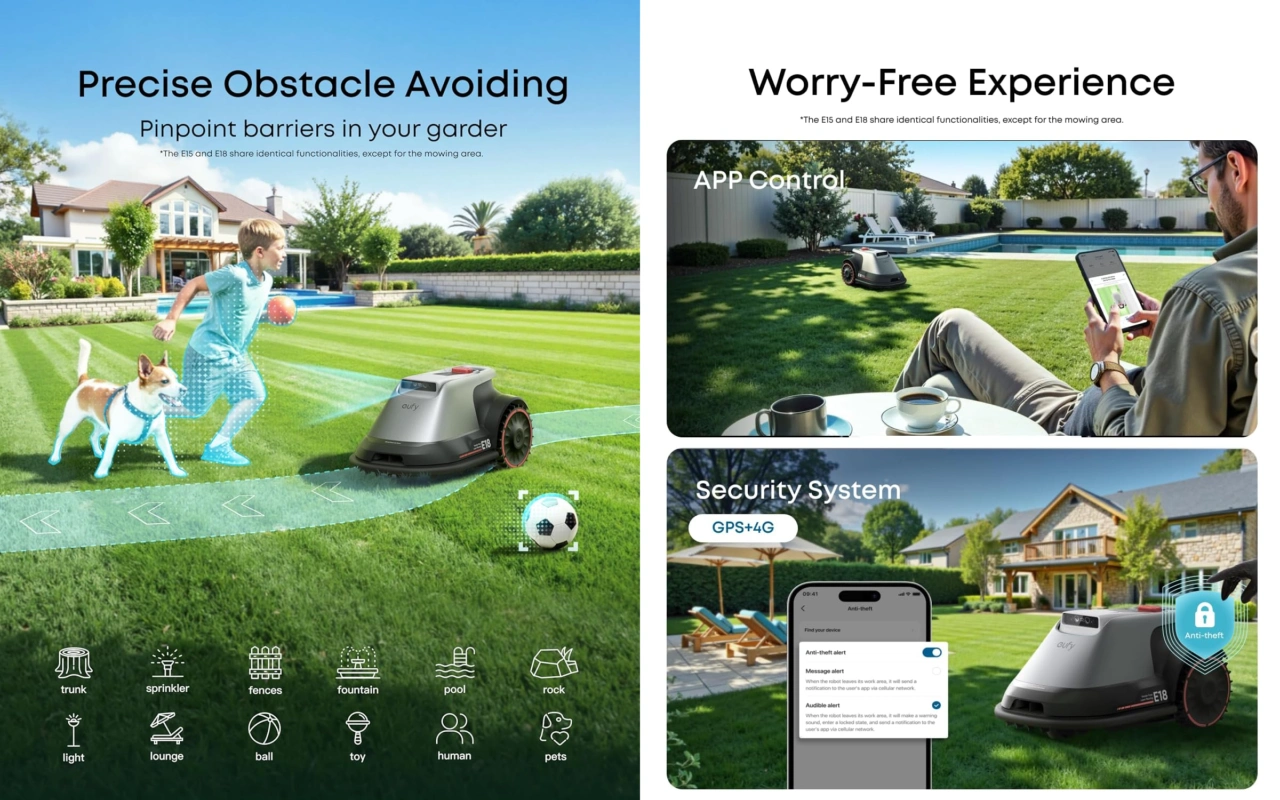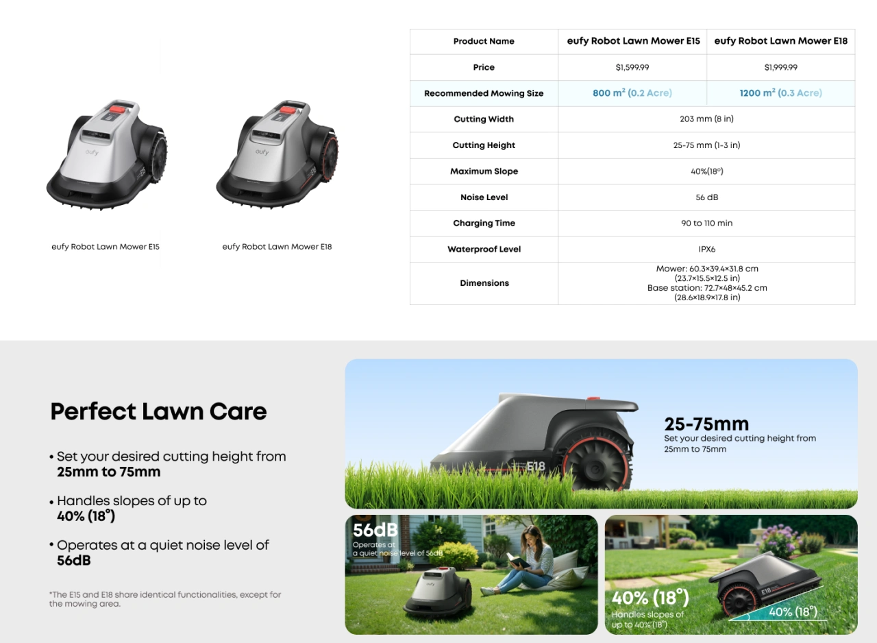 米Ankerは同社の家電/セキュリティブランドeufyから、新たに独自のeufy V-FSD 1.0技術を搭載し効率的に芝を刈ることができるロボット芝刈機「eufy Robot Lawn Mower E15/E18」を発売しています。