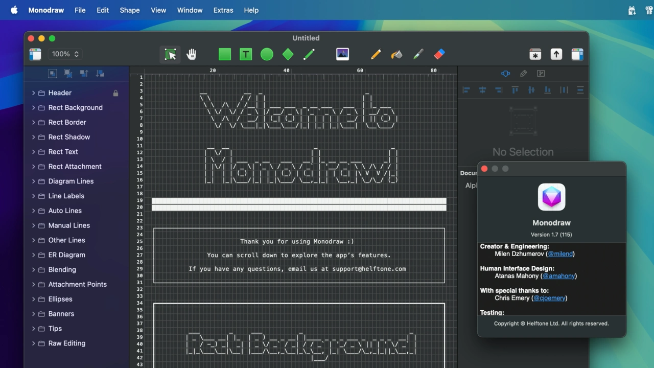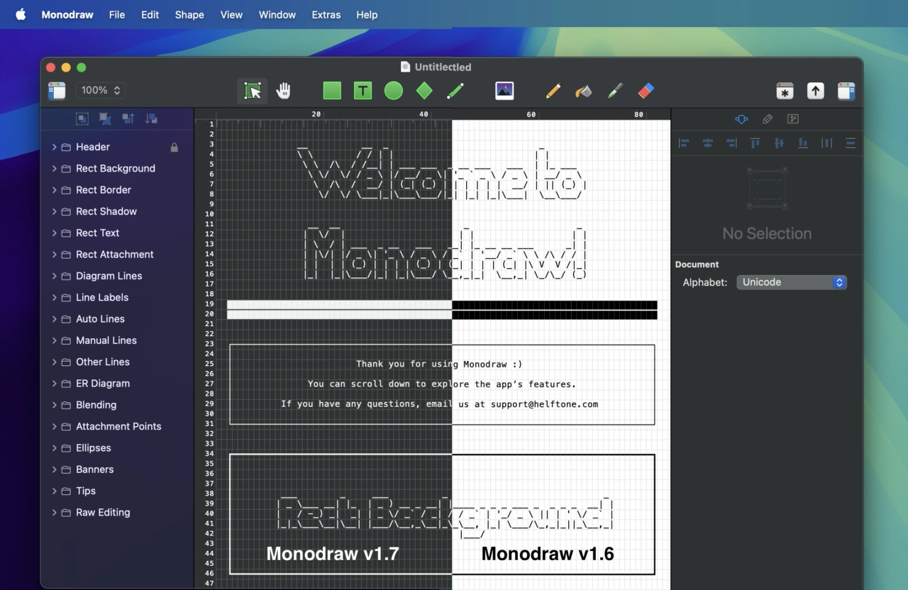 MonodrawはiPhone用タスク管理アプリClearシリーズを開発していたMilen Dzhumerovさんら2014年にリリースしたMac用アスキーアート・エディタアプリで、ReadmeやHTMLファイルにダイアグラムや隠しメッセージを書けるように開発されていますが、2025年04月08日付けで新たに「Monodraw v1.7」のPublic Test版がリリースされています。