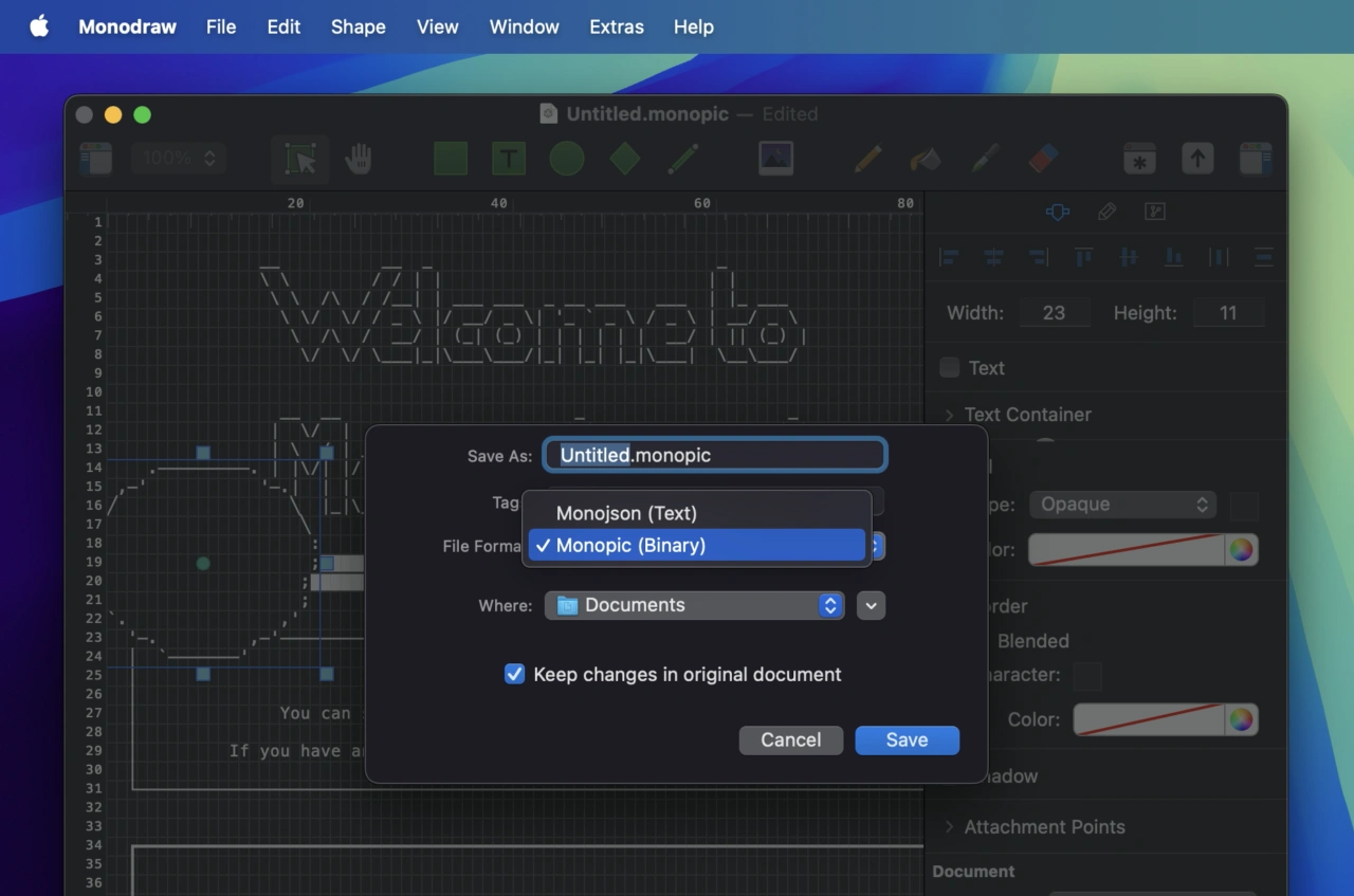 Monodraw v1.7では、新たにmacOSのダークモード実行時にキャンバスにもダークモードが反映されるようになる他、保存時に従来のバイナリーフォーマット(.monopic)とは別に新しいプレーンテキストフォーマット(.monojson)が選択できるようになっています。