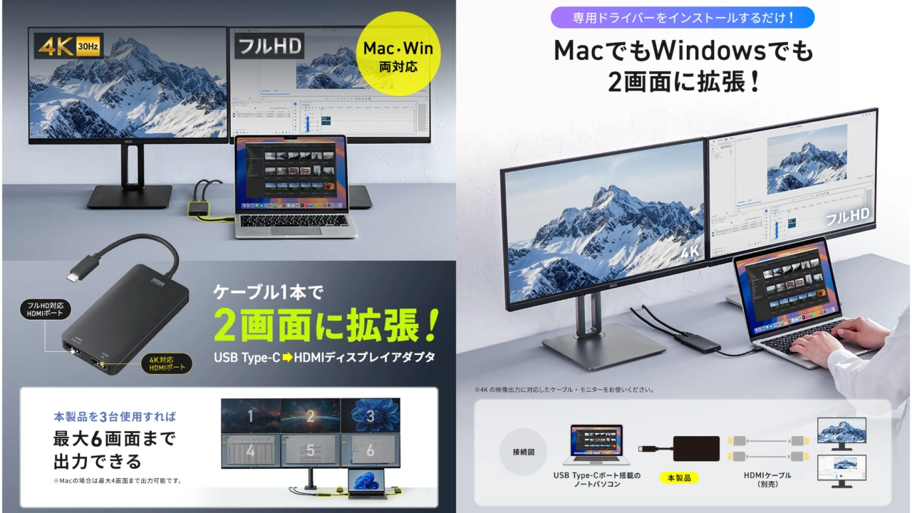 ドライバーをインストールすることで外部ディスプレイ出力制限のあるApple Silicon MacやWindows PCでもUSB-C1ポートから最大2台の外部ディスプレイ出力を可能にする変換アダプターで、複数のUSB-Cポートとアダプタを利用することでWindows PCでは最大6台、Macでは最大4画面出力も可能。