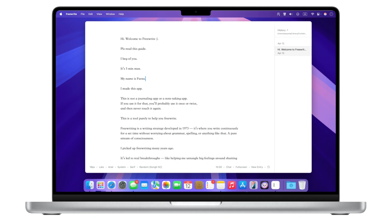 freewriteはFarzaさんが考えを整理するために開発したMac用テキストエディタで、日記やメモ帳などではなく、時間を気にせず文章の作成に集中できるよう、閉じるや拡大縮小ボタン、メニューバーなどもなく、日本語の縦書きに対応した文章作成アプリ「stone」やMarkdownエディタ「iA Writer」よりストイックなデザインとなっている一方、