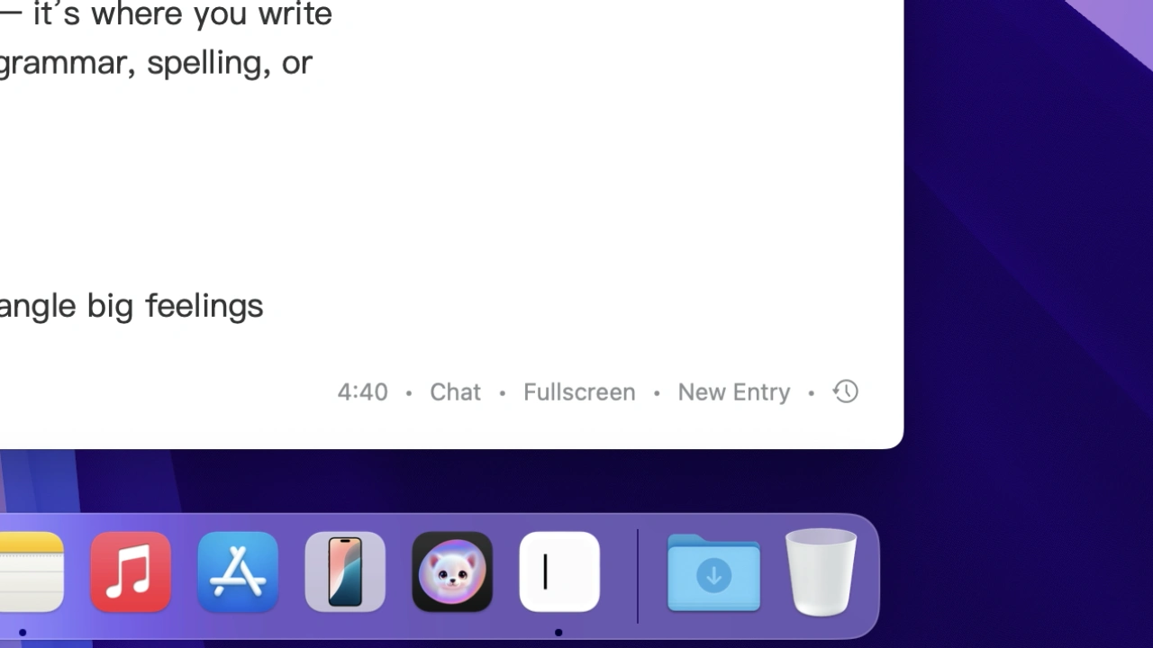 freewriterアプリの右下にマウスカーソルを合わせると、タイマー(デフォルトは15分でスクロールで変更可能)やChatGPT/Claudeへのリンク、フルスクリーン化、新しいエントリーの作成、過去に作成した文章の履歴ボタンが表示されるようになっています。