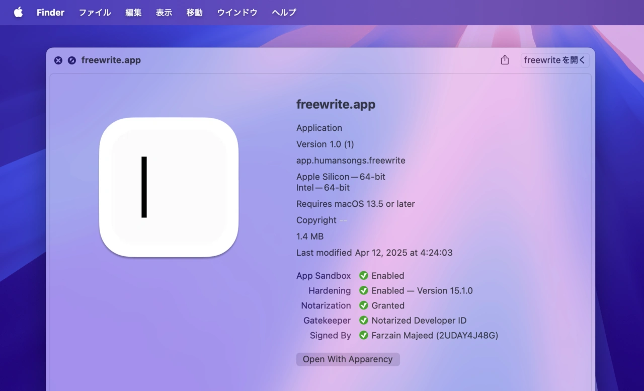 freewriterのシステム要件はmacOS 13.5 Ventura以降のIntel/Apple Silicon Macで、ソースコードはMITライセンスで公開されており、アプリは公式リポジトリまたは公式サイトから無料ダウンロードできるので、文章作成に集中したい方はチェックしてみてください。