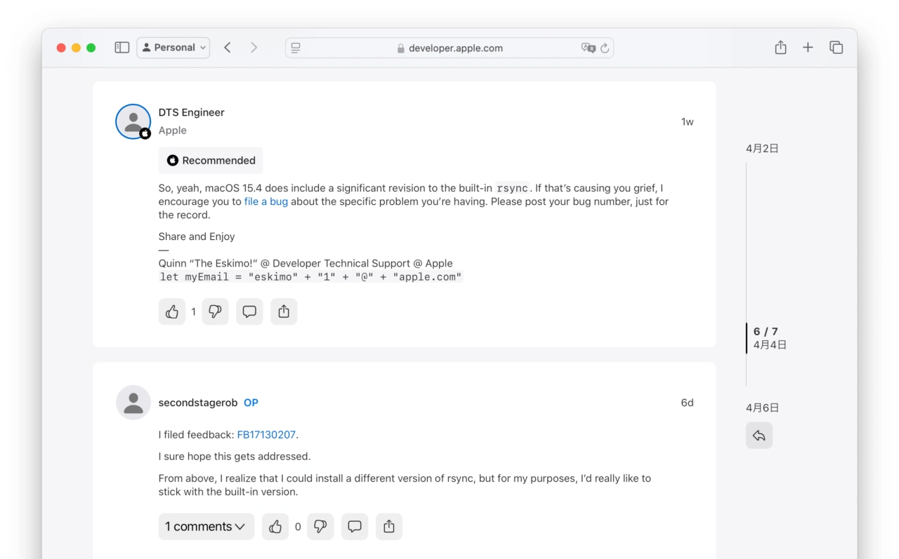 AppleのDTSエンジニアのQuinnさんによると、現地時間2025年03月31日にリリースされた「macOS 15.4 Sequoia (24E248)」では、macOS 15.0でrsyncから変更されたopenrsync(built-in rsync)に大幅な変更が追加され、rsyncとの互換性が向上しているそうです。
