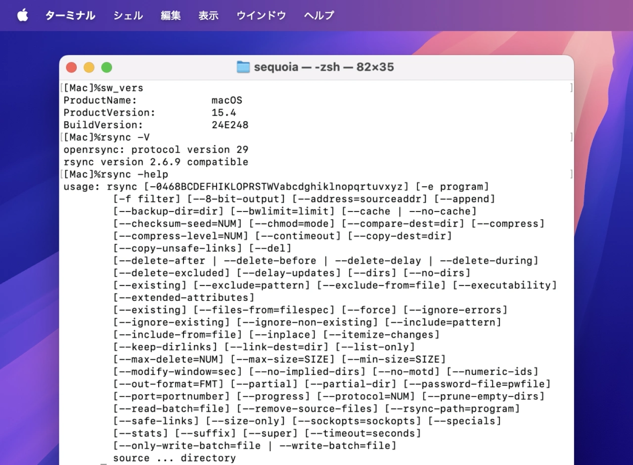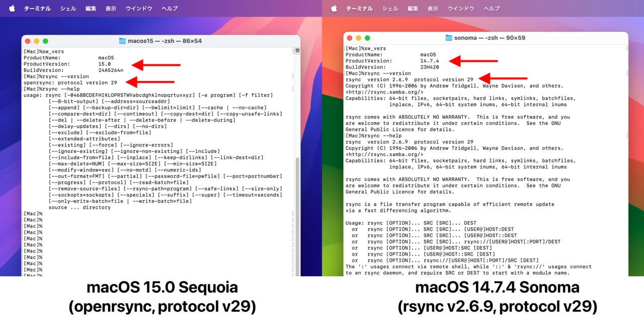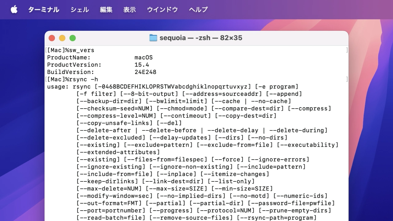 macOS 15.4とmacOS 15.3のopenrsyncと macOS 14.7のrsyncオプション