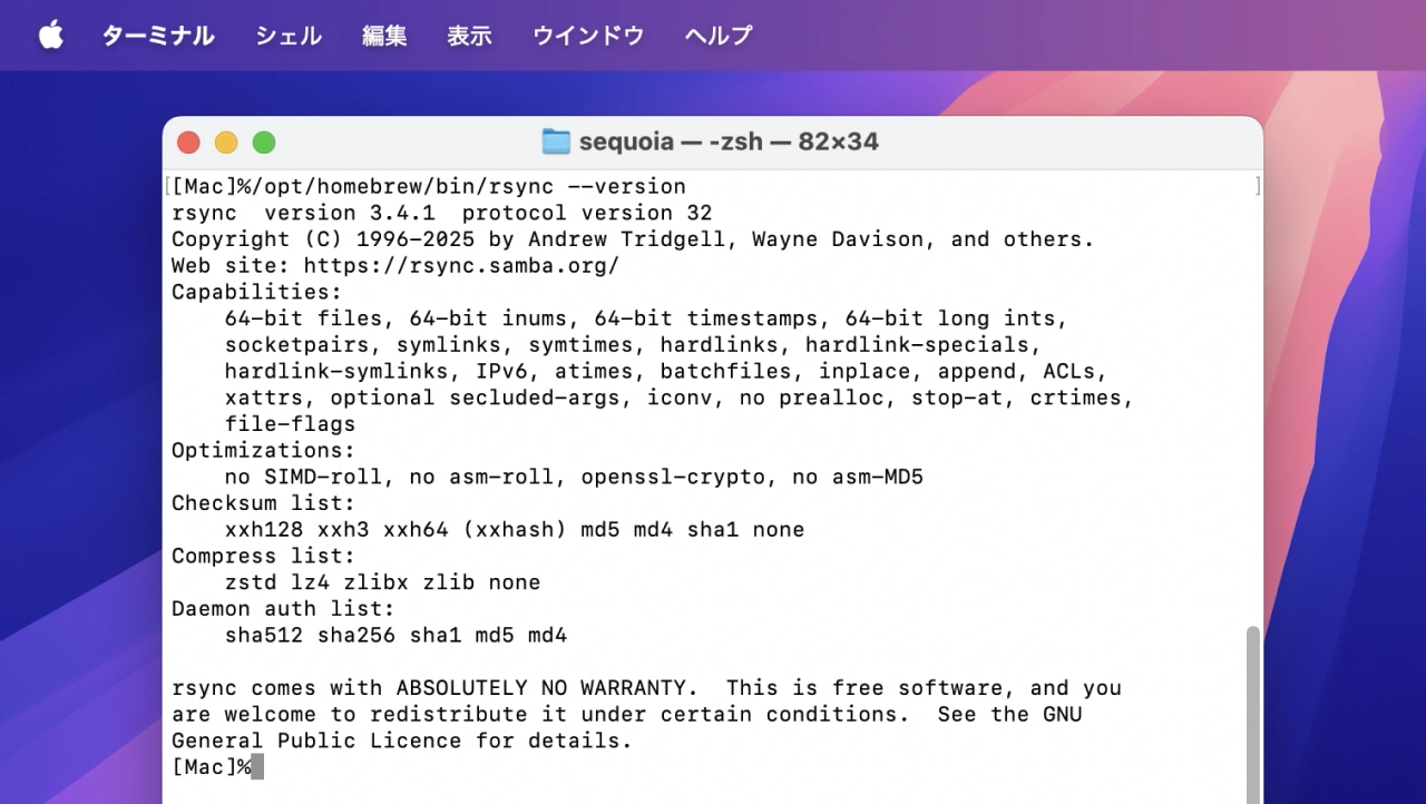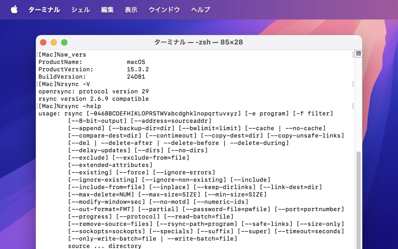 macOS 15.3のopenrsync: protocol version 29 rsync version 2.6.9 compatible