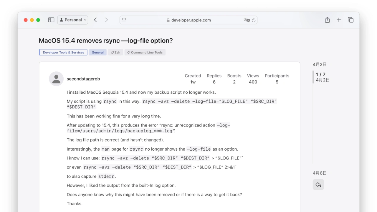 MacOS 15.4 removes rsync —log-file option? – Apple Developer Forums