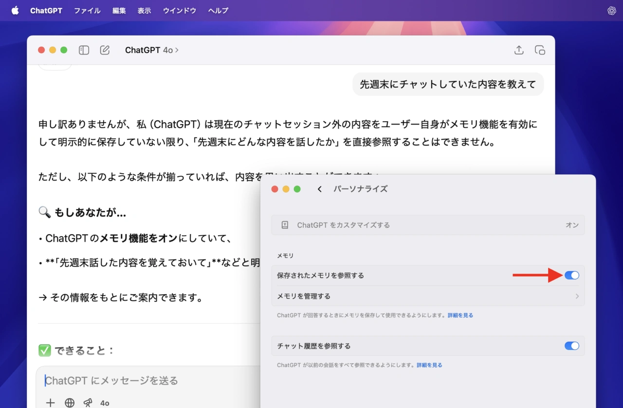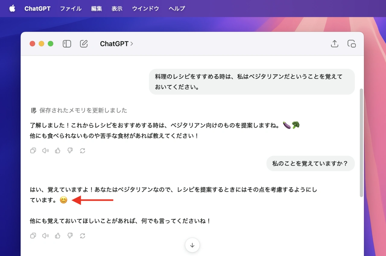 ChatGPTはより多くの過去のチャットを記憶するようになったため、何度も繰り返して言う必要はありません。あなたについて記憶している内容を変更したい場合は、そのように頼みましょう。ChatGPT for Macより