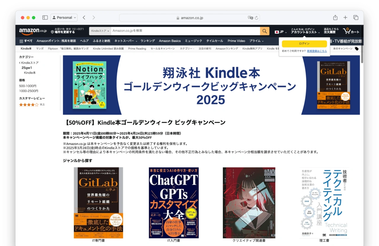 Amazon Japanは日本時間2025年04月18日09時より、ゴールデンウィークを前に連休を楽しく過ごすのに必要なアウトドア製品や衣類、ゲーム、家電などを特別価格で販売する「ゴールデンウィークスマイルSALE」を開催すると発表していますが、このGWセールを前に、KindleストアでChatGPTやプログラミング、おうちで学べる/あたらしい1年生シリーズなどの翔泳社のIT入門書が最大50OFFとなるビックキャンペーンが開催されています。