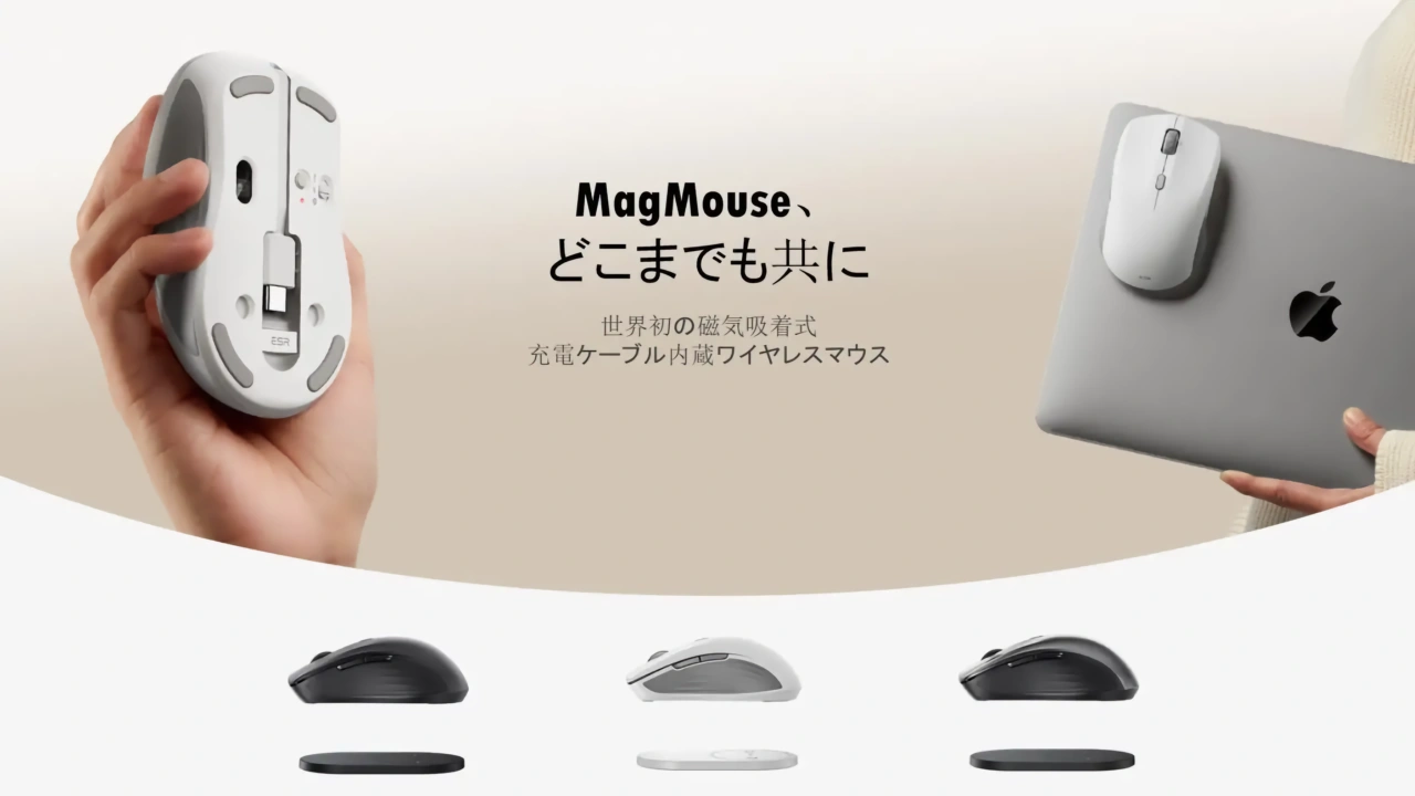 MagMouseはマウスの底面にマグネットが内蔵されており、付属のマグネットベースをMacBookなどのノートPCの天板に貼り付けておくことでノートPCとマウスを合わせて素早く持ち運べるワイヤレスマウスで、