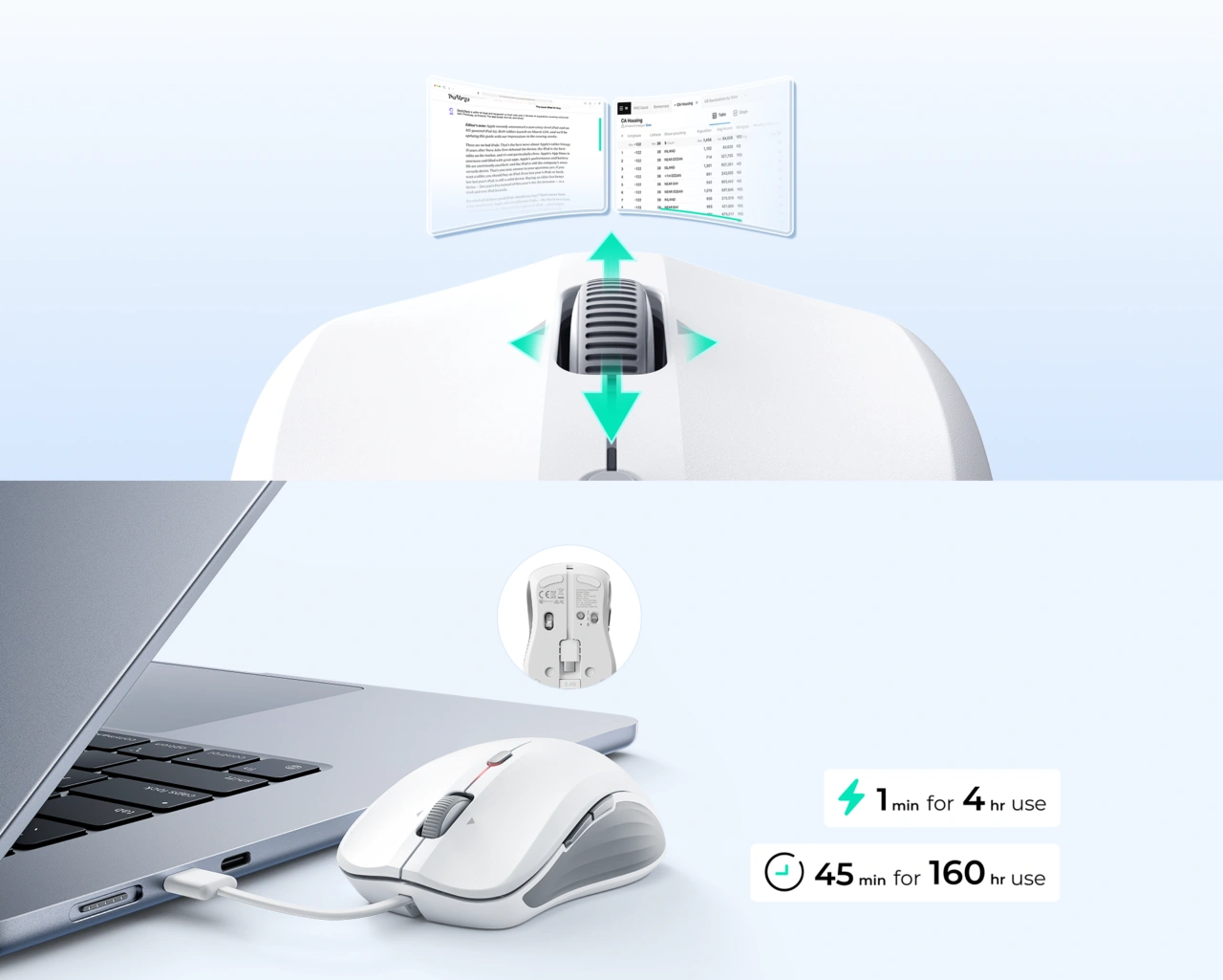 スクロールホイールは4方向スクロールに対応し、バッテリーはUSB-C充電式で充電用USB-Cケーブルは底面に収納されており、45分のフル充電で最大160時間、1分の充電でも最大4時間利用可能な高速充電にも対応。