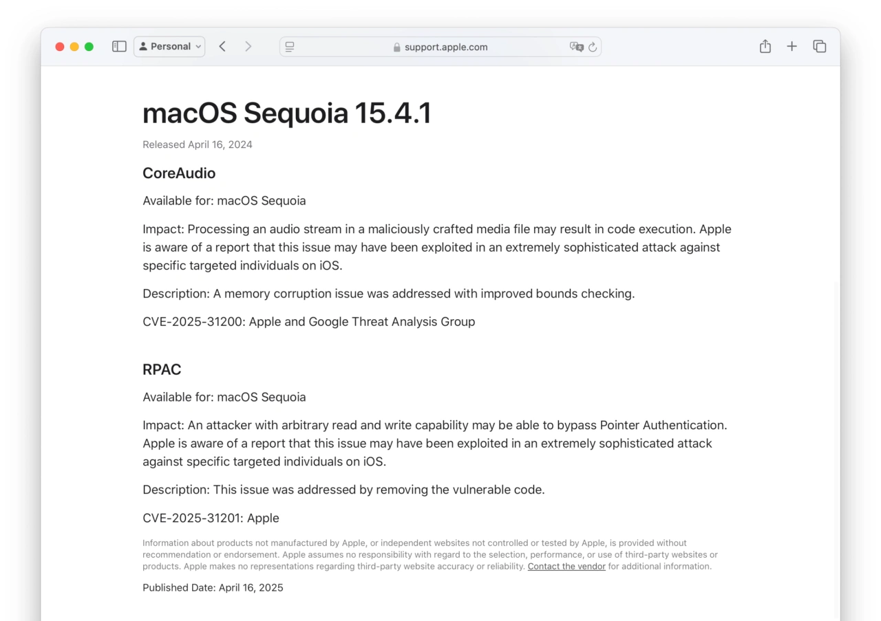 Appleによると、macOS 15.4.1では重要なバグ修正と、同時にリリースされた「iOS/iPadOS 18.4.1 (22E252)」でも修正されているCoreAudioとRPACの不具合を利用した脆弱性が修正されており、