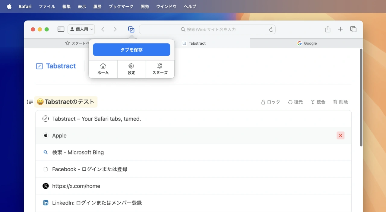 Safariで開いている複数のタブをワンクリックで保存/復元できる機能拡張「Tabstract」がリリースされています。詳細は以下から。
