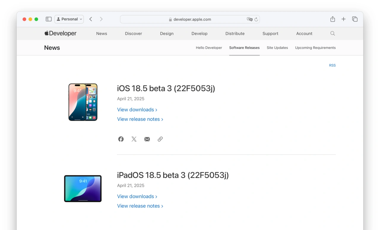 Appleは現地時間2025年04月21日付けで、開発者向けに「iOS/iPadOS 18.5」や「macOS 15.5」、「tvOS 18.5」、「visionOS 2.5」、「watchOS 11.5」のBeta 3を公開しています。