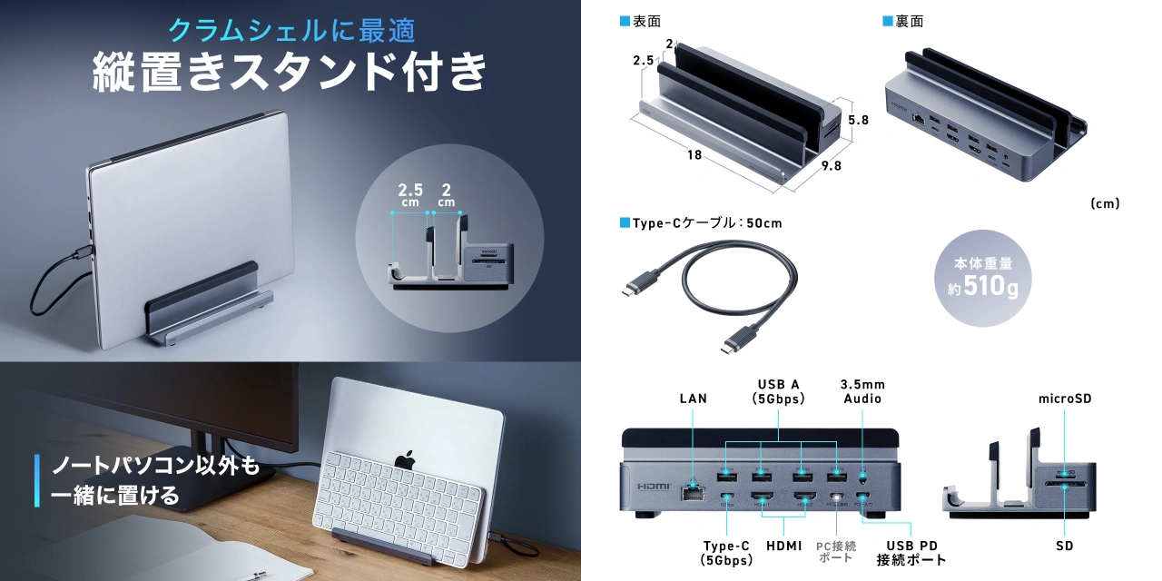 ノートパソコン を縦置きできる、 スタンド一体型 の Type-C ドッキング ステーション です。 ノート PC スタンド と ドックステーション が一体型になっているため、省スペースでスタイリッシュに設置することができます。
