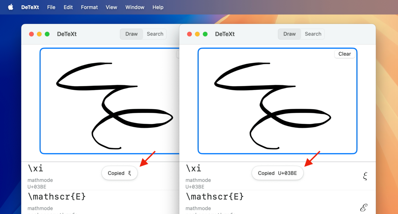 DeTeXt for Mac v1.8では、新たに手書きと検索ウィンドウが分割され、UIがよりコンパクトになった他、シンボルやLaTeXコマンドをダブルクリックした際に、文字/コマンド/Unicodeのどれがコピーされたかがポップアップされ分かるようになっています。