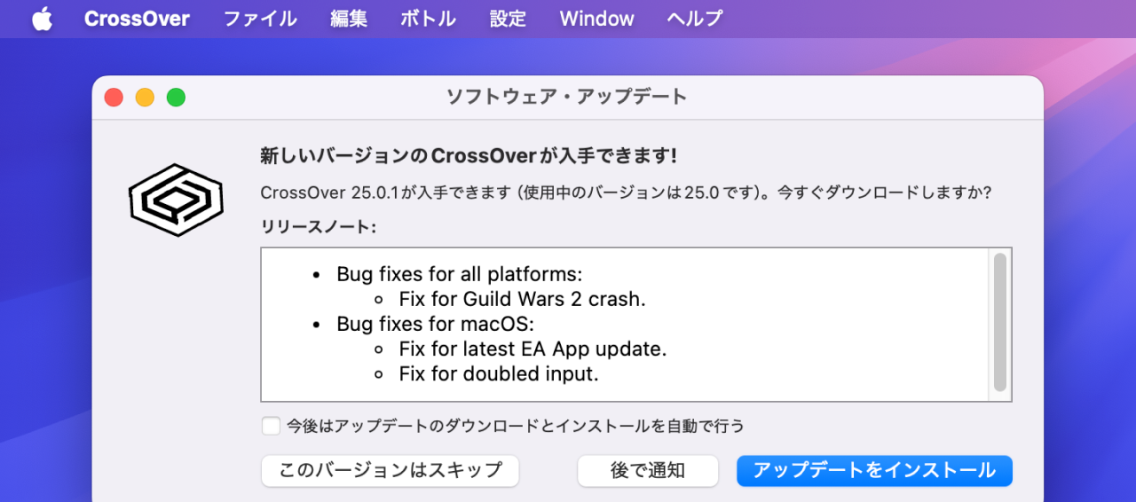 CrossOver v25.0.1は今年03月にリリースされた、Wine v10.0を含むD3D11のMetalベース実装DXMTやD3DMetal 2.1のアップデートによりApple Silicon Macで「ストリートファイター6」や「Need for Speed Heat」「仁王2 Complete Edition」「Teardown」「Age of Wonders 4」「Dragon’s Dogma 2」「The Last of Us Part 1」などの多数のゲームがプレイできるよう「CrossOver v25.0」のHotfixで、