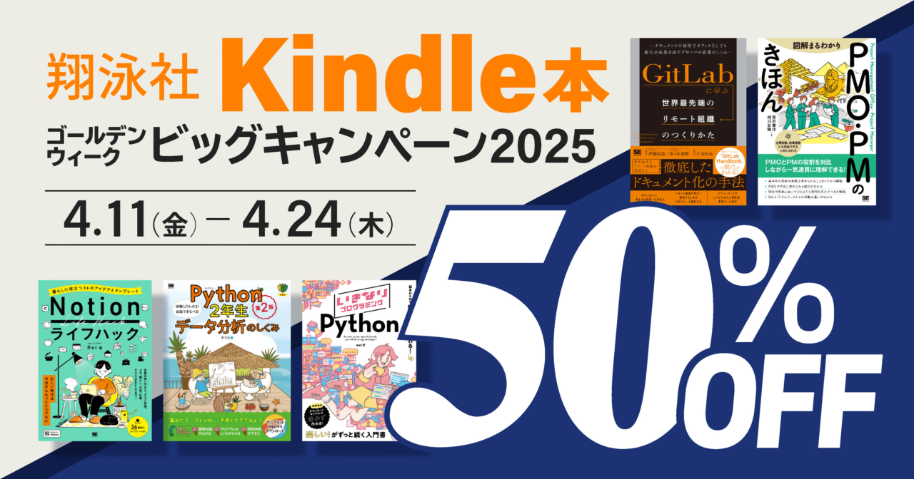 Amazon Japanは日本時間2025年04月11日より、ゴールデンウィーク(GW)の期間中に読みたいKindle本を最大90%OFFで販売する「ゴールデンウィークセール 第一弾」を開催していますが、このGWセールに合わせて図解まるわかりシリーズやエンジニアのための文章作成シリーズなど翔泳社のIT入門書が最大50OFFとなるビックキャンペーンが本日04月24日まで開催されています。