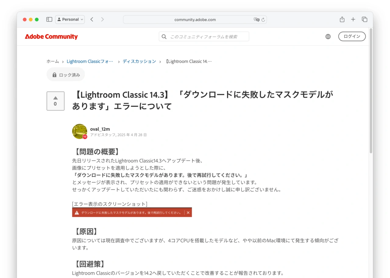 先日リリースされたLightroom Classic14.3へアップデート後、画像にプリセットを適用しようとした際に、「ダウンロードに失敗したマスクモデルがあります。後で再試行してください。」とメッセージが表示され、プリセットの適用ができないという問題が発生しています。【Lightroom Classic 14.3】 「ダウンロードに失敗したマスクモデルがあります」エラーについて – Adobe Community