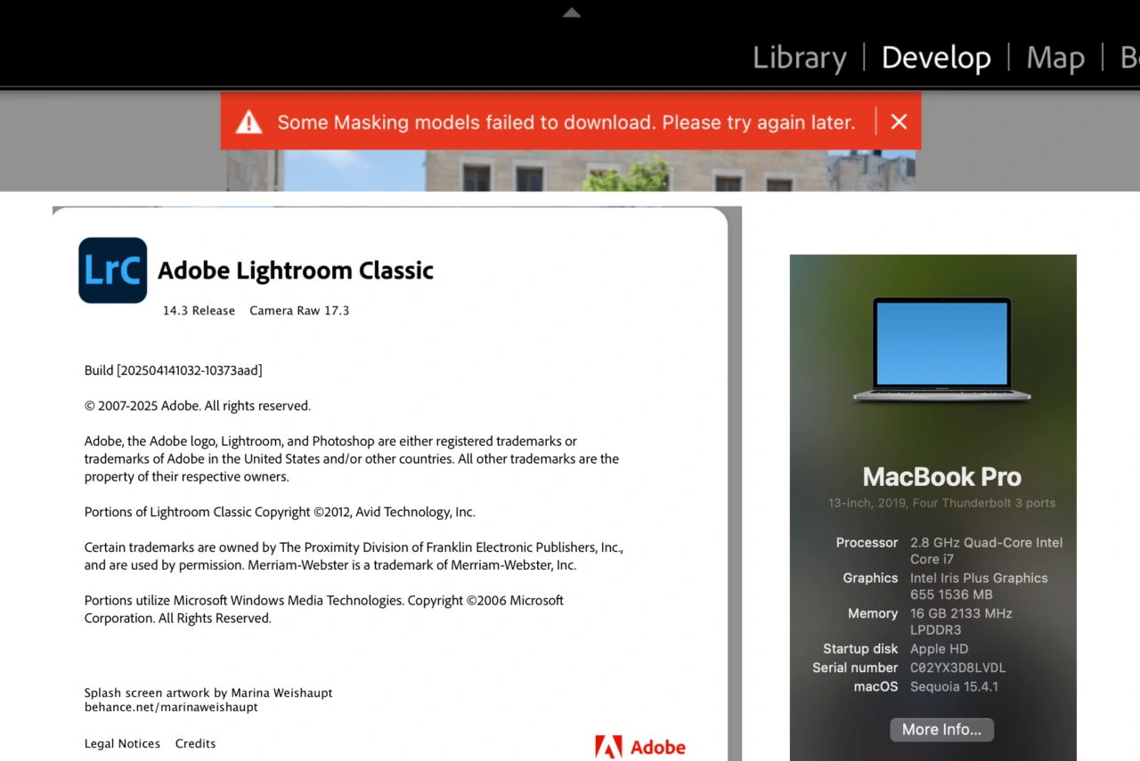 この不具合はAdobe Communityで報告されており、問題が発生しているのは一部のIntel Macのようで、問題が発生すると「ダウンロードに失敗したマスクモデルがあります。後で再試行してください。(Some masking models are downloading. Please try again later)」とメッセージが表示され、プリセットが適用できなくなるため、日本のサポートサイトでは問題が解決するまでLightroom Classicのバージョンを14.2へダウングレードするようにコメントされています。