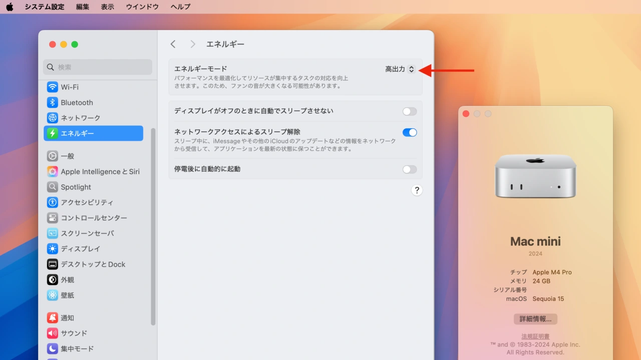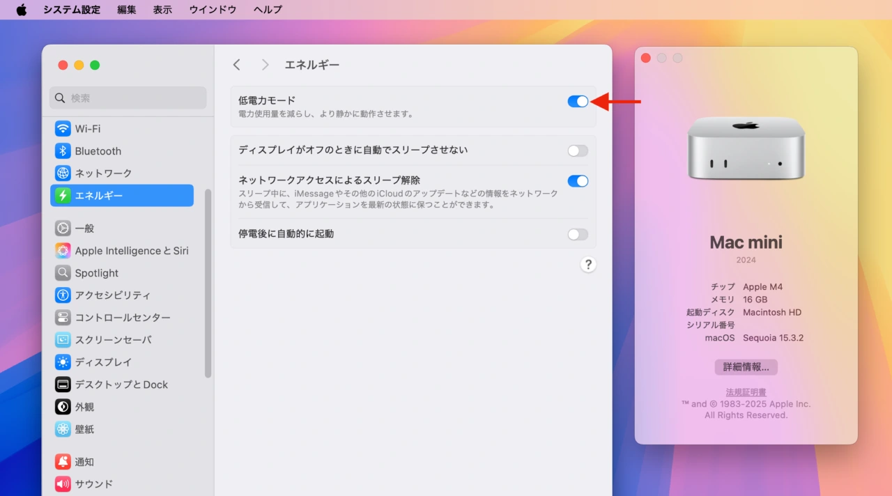 なお、Apple M4チップ搭載のMac mini (2024)を含め、多くのApple Silicon Macでは電力消費量を低くしパフォーマンスを下げることで、バッテリー消費とファンノイズを抑える「低電力モード (Low Power Mode)」がサポートされているので、M4 Mac miniをサーバー用途などに利用されている方は試してみてください。