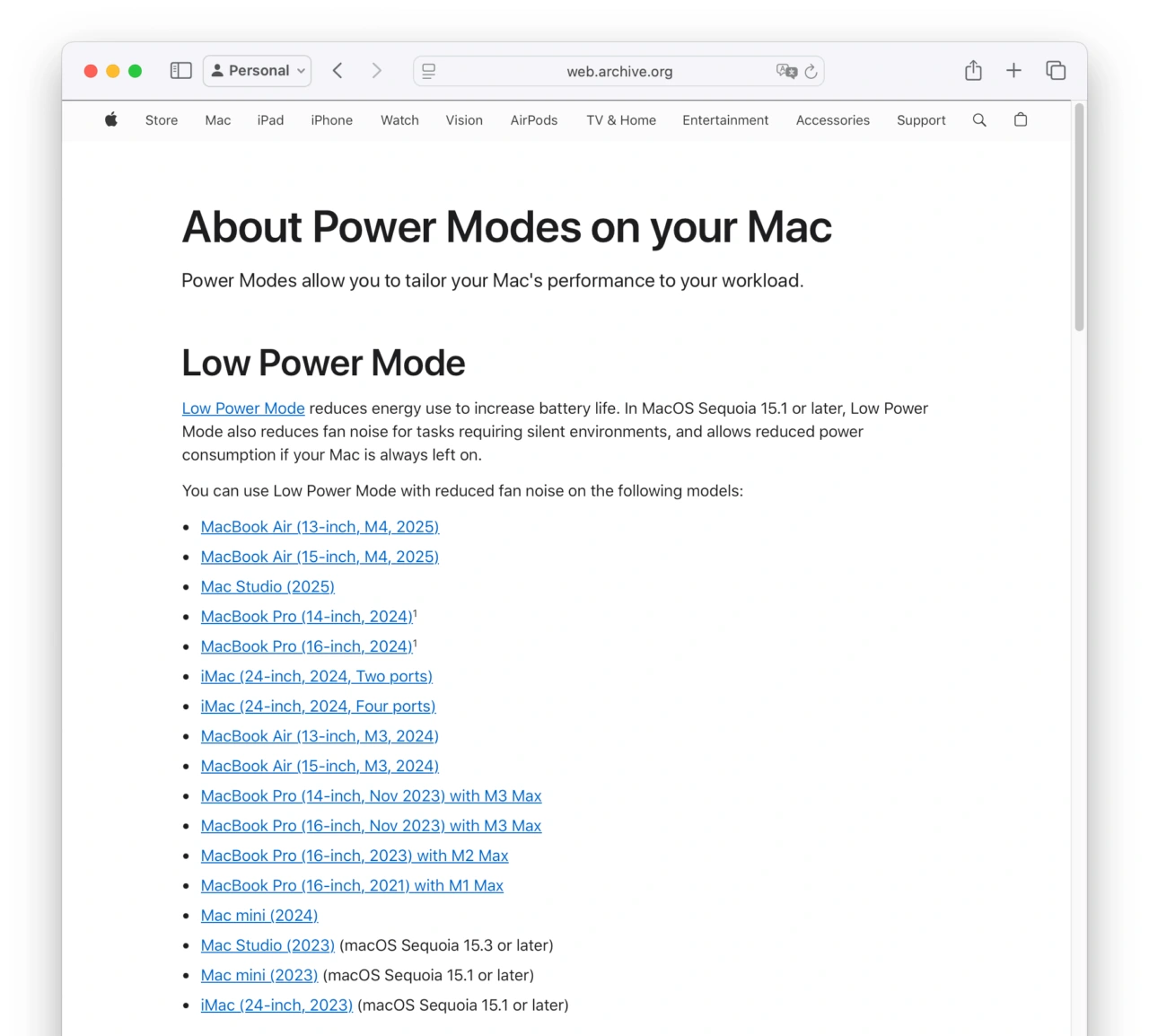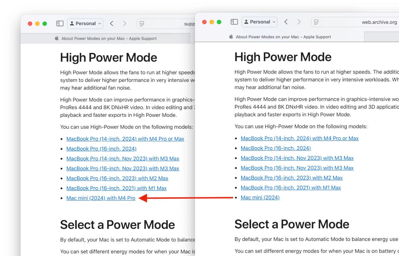 Appleは現地時間2025年04月28日、この高出力モードをサポートするMacのリストに記載していた「Mac mini (2024)」を、Apple M4 Proチップ搭載のMac mini「Mac mini (2024) with M4 Pro」に修正しています。