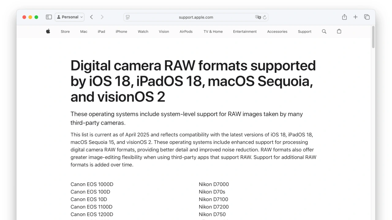 Digital camera RAW formats supported by iOS 18, iPadOS 18, macOS Sequoia, and visionOS 2 – Apple Support