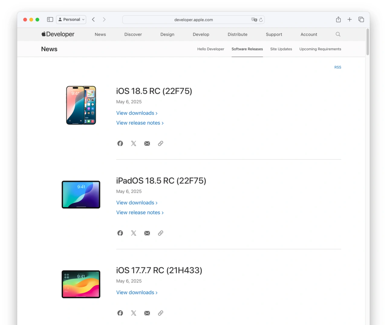 Appleは現地時間2025年05月06日付けで、開発者向けに「iOS/iPadOS 18.5」や「macOS 15.5」、「tvOS 18.5」、「visionOS 2.5」、「watchOS 11.5」のリリース候補(RC:Release Candidate)版を公開しています。