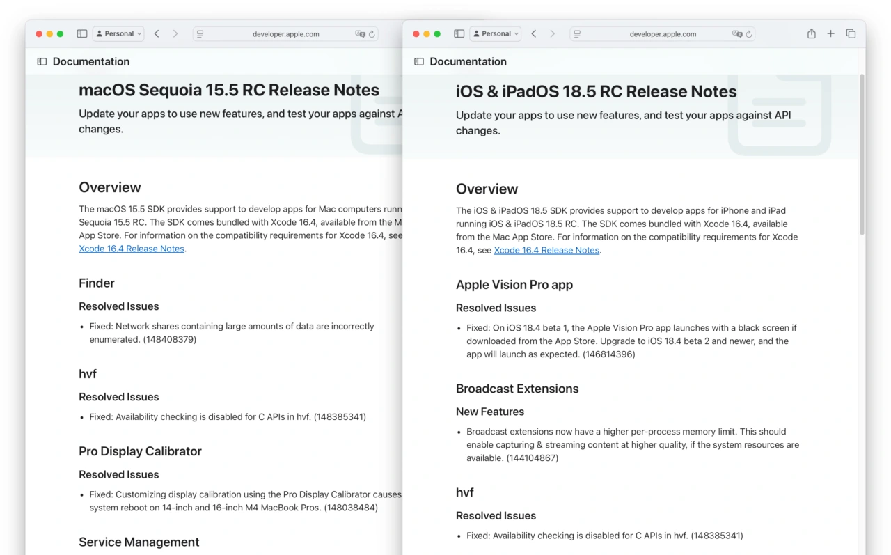 macOS 15.5 SequoiaやiOS/iPadOS 18.5, VisionOS 2.5などのRC版のリリースノートはBeta版とかわらず、大量のデータが存在する共有ネットワークディスクがFinderで正しく表示されない不具合や、hvf(Hypervisor Framework)でC APIのアベイラビリティチェックが無効になっていた問題、StoreKit、Writing Toolsの修正がメインとなっており、