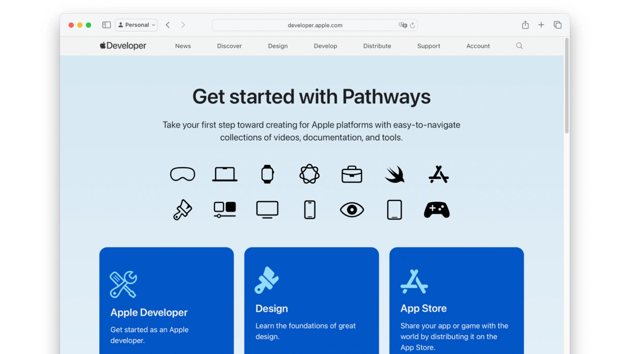 AppleがWWDC25を前にAppleプラットフォーム向けの開発を行う最初のステップを紹介する「Pathway」ページをアップデートしています。詳細は以下から。